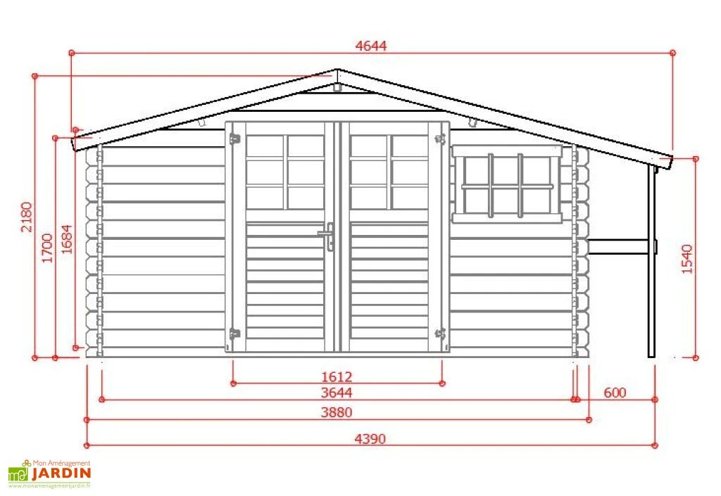 Votre abri de jardin occupe une surface au sol de 11,56 m² (3,88×2,98m (l,l)) et une surface hors-tout de 14 m² (4,64×3,01m (l,l)). Le toit, d’une surface de 13,97 m², est recouvert d’un voile bitumĂ©. La toiture prĂ©sente un dĂ©port de 60cm sur sa partie droite. La charge permanente supportĂ©e par le toit est de 30 kg/m² (il n’est pas possible de couvrir le toit avec des tuiles car la charge reprĂ©sentĂ©e serait de 40 kg/m²).