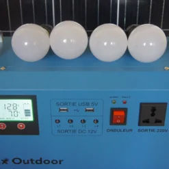 Ce kit solaire portable est composé d’un panneau solaire de 150 W, d’un générateur, d’une batterie au plomb de 12 V, de 4 ampoules LED waterproof ainsi que d’un chargeur standard européen AC dont le câble d’alimentation est de 5 m.