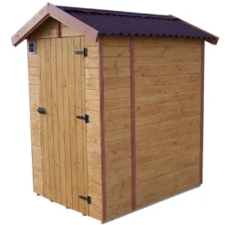 Le plancher en panneaux de particules traités de 12 mm est fourni. La porte, de 80 x 174 cm (l,h), est équipée d’un loquet pour cadenas.