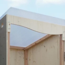 Ce cabinet possède un design sobre et élégant avec une ouverture frontale courbée qui intègre une poignée ainsi qu’un verrou. Cet abri dispose également d’un toit translucide qui permet de laisser passer la lumière. Cette cabane en bois de 170 kg se veut solide et permet de durer dans le temps grâce à ses visseries et charnières de qualité supérieure en inox.