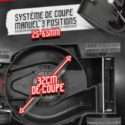 Cette tondeuse à gazon électrique vous permettra d’entretenir la pelouse de votre jardin en toute simplicité. Elle possède un moteur d’une puissance de 1300 W (3450 t/min), affiche une largeur de travail de 32 cm et dispose d’un système de réglage manuel de la hauteur de coupe sur trois positions, entre 25 et 65 mm. L’herbe tondue sera ensuite collectée par le bac de 25 L également inclus.