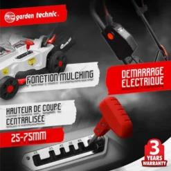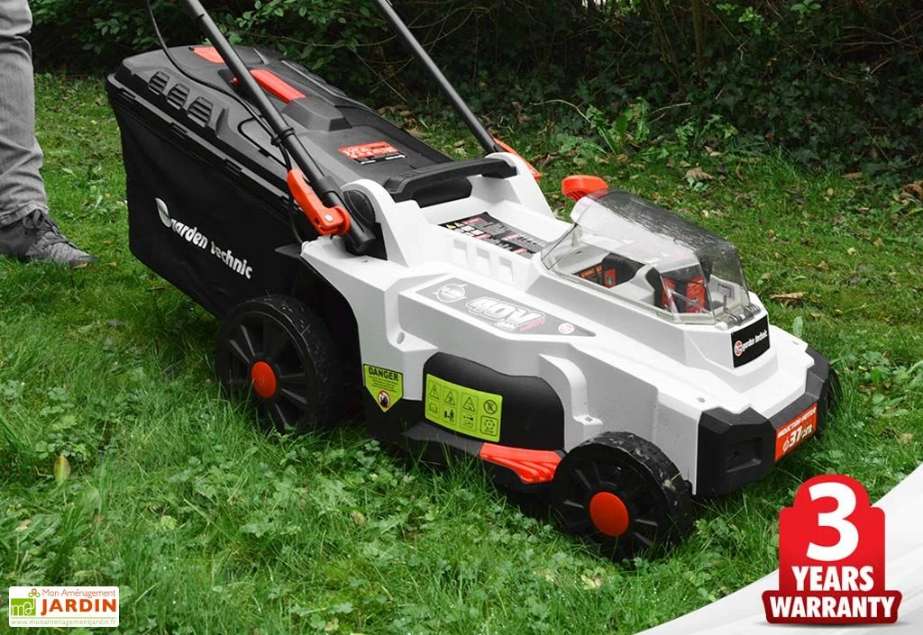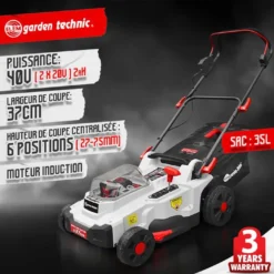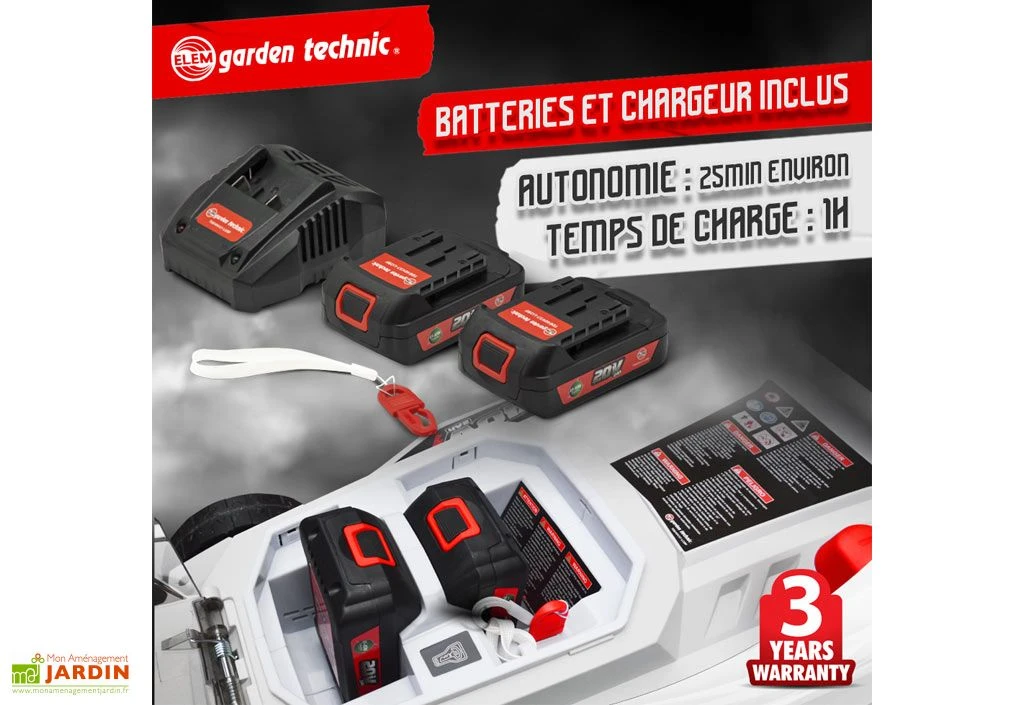 La tondeuse à gazon de la marque Elem Garden est une tondeuse électrique sans fil. Elle est équipée de 2 batteries lithium d’une puissance de 20V chacune, qui offrent une autonomie de 25 minutes. Elles nécessitent un temps de charge de 1 heure.