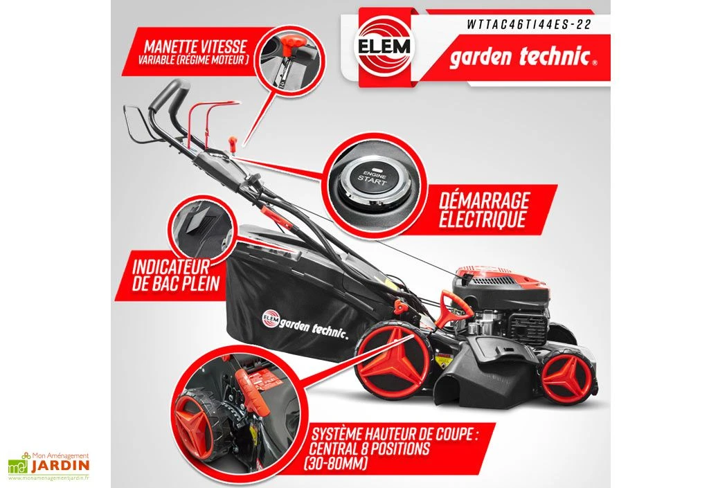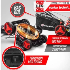 Cette tondeuse à gazon thermique de chez Elem Garden Technic intègre un moteur à essence d’une puissance de 144,3 CC. Elle dispose d’un démarreur électrique qui vous assure un démarrage facile et sans aucun effort. De plus, la tondeuse possède un système d’auto-traction, idéal pour tondre des grandes surfaces de pelouse.