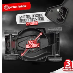 Efficace et facile à manier, la tondeuse électrique que comprend cet ensemble est dotée d’un moteur d’une puissance de 1300 W. Elle dispose d’une lame de 32 cm et d’un système de réglage manuel permettant d’ajuster la hauteur de coupe selon trois positions, entre 25 et 65 mm. Son carter en polypropylène lui assure légèreté et longévité tandis que son bac récolteur de 30 L se chargera de collecter l’herbe tondue.