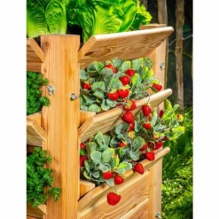 L’ensemble de cette tour de culture, structure et lamelles latérales inclinables (qui permettent d’augmenter la surface cultivable), est fabriqué en mélèze, un bois parfait pour l’extérieur puisque quasiment imputrescible. Cette essence se montrera donc extrêmement résistante en cas d’intempéries et ne craindra pas les attaques d’insectes qui pourraient détériorer le bois. Notez que le bois utilisé provient de forêts gérées de manière durable et qu’il est à ce titre certifié FSC.