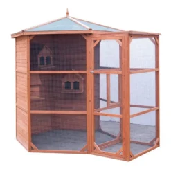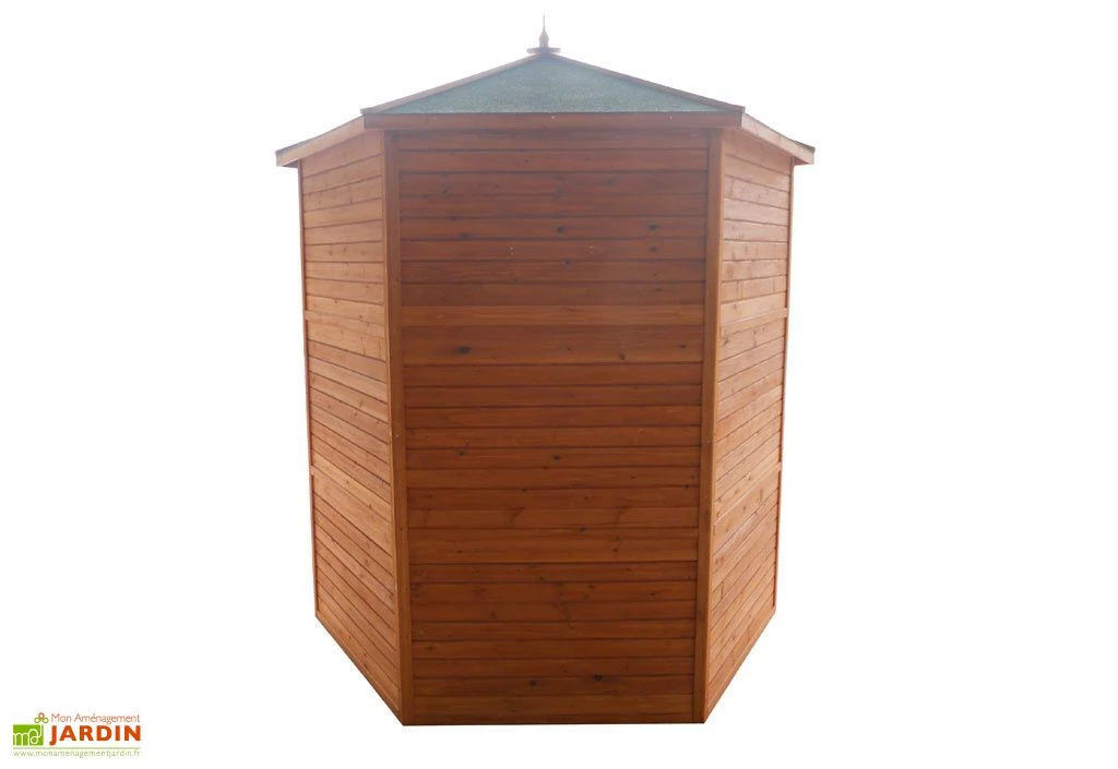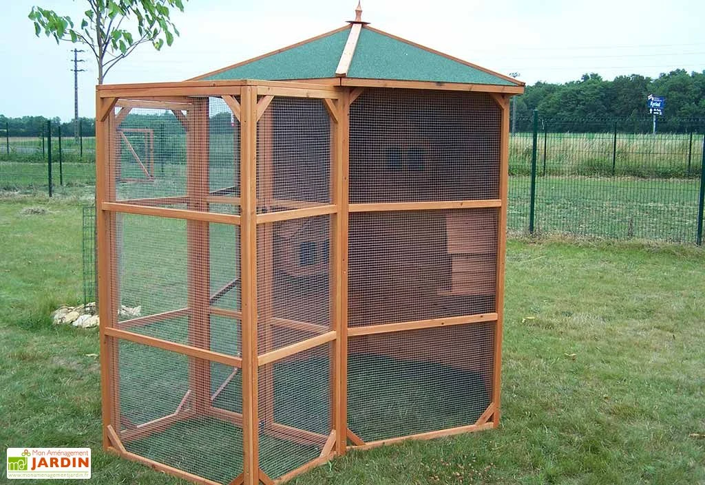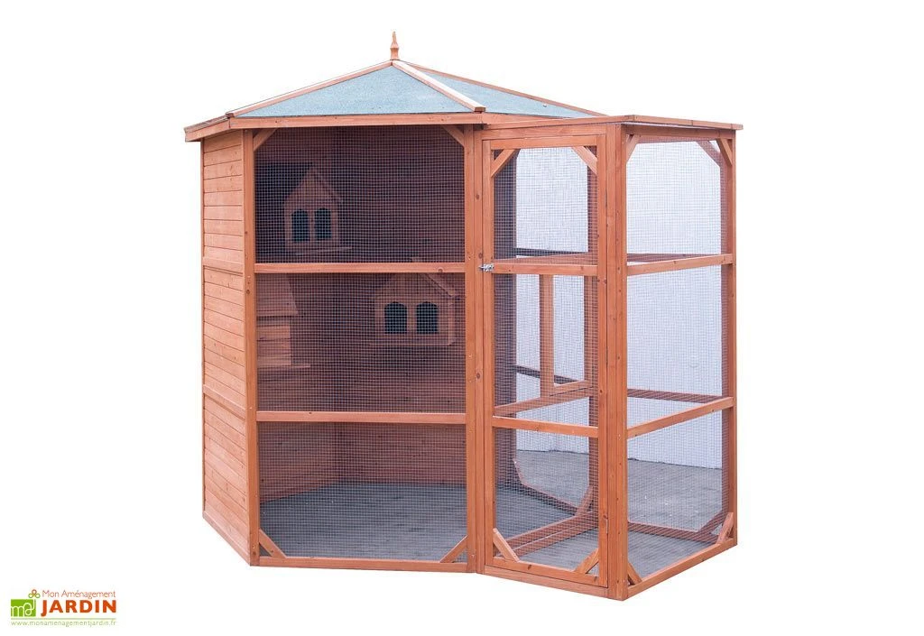 La volière hexagonale de chez Habrita dispose d’un sas d’entrĂ©e pour Ă©viter aux oiseaux de s’Ă©chapper lors des entrĂ©es et sorties dans la cage. Elle est Ă©quipĂ©e de murs pleins en bois certifiĂ© FSC de 10 mm d’Ă©paisseur et de murs grillagĂ©s. Elle est livrĂ©e avec des perchoirs. Le toit est bitumĂ©. Les dimensions au sol sont 200 x 200 cm + un sas d’entrĂ©e de 98 x 65 cm et hors tout : 235 x 235 x 238 cm (l,l,h).Â